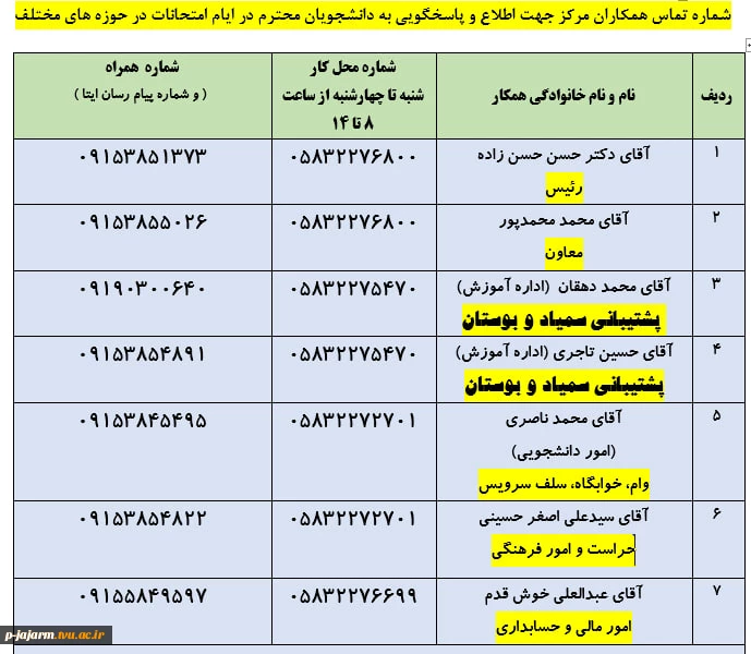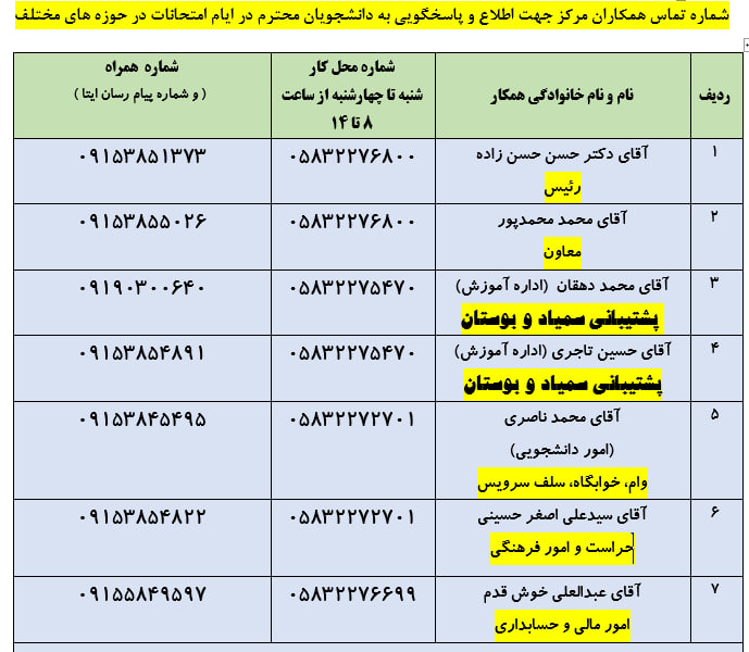 شماره تماس همکاران مرکز جهت اطلاع و پاسخگویی به دانشجویان محترم در ایام امتحانات پایان نیمسال در حوزه های مختلف